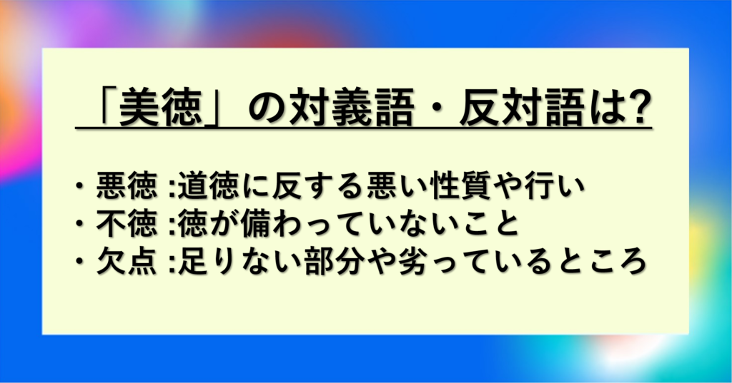「美徳」の対義語・反対語について、詳しく見てきました。