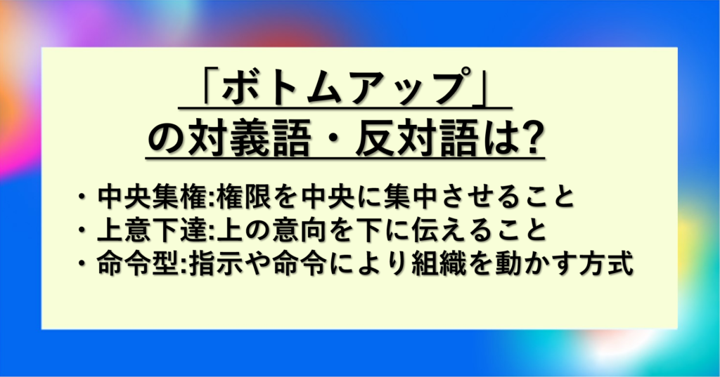 続いては、「ボトムアップ」の類義語にも触れながら、対義語との関係性を見ていきましょう。