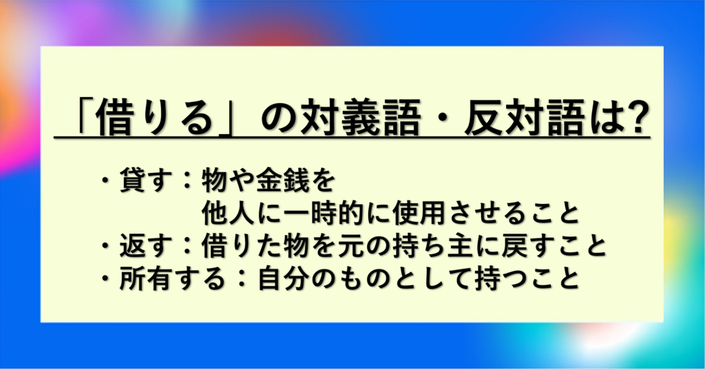 続いては、「借りる」の類義語にも触れながら、対義語との関係性を見ていきましょう。