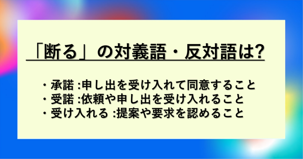 続いては、「断る」の類義語にも触れながら、対義語との関係性を見ていきましょう。