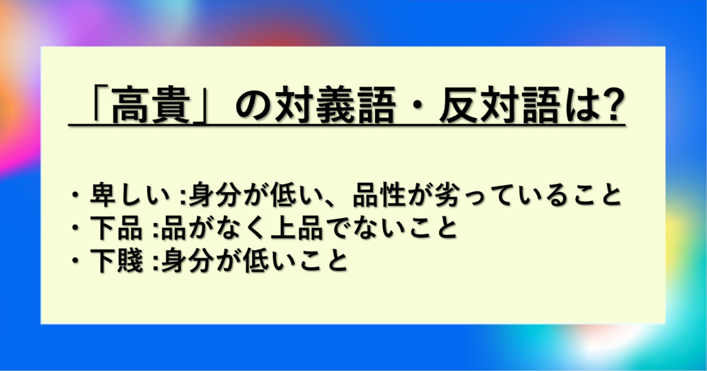 続いては、「高貴」の類義語にも触れながら、対義語との関係性を見ていきましょう。