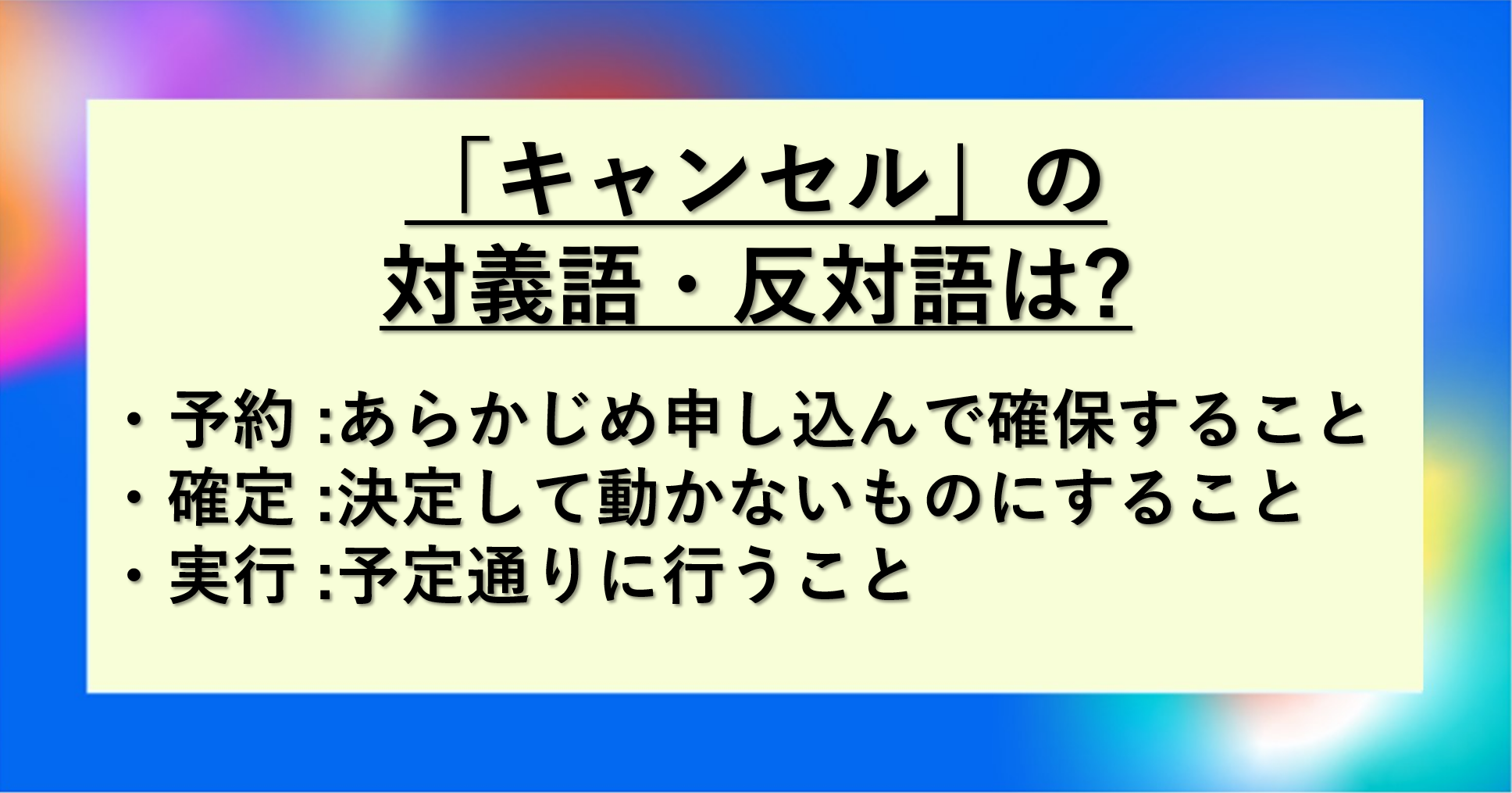 「キャンセル」の対義語・反対語について、詳しく見てきました。