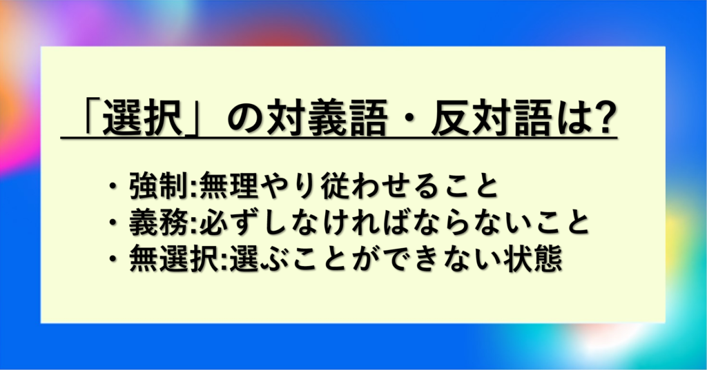 対義語を知ることで、「選択」という言葉の本質が見えてきます。