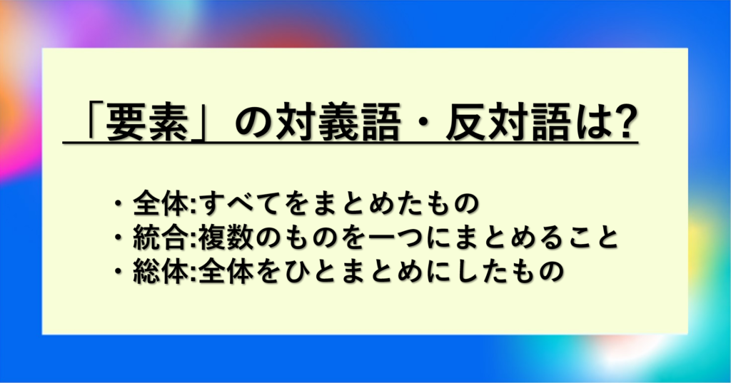 続いては、「要素」の類義語にも触れながら、対義語との関係性を見ていきましょう。